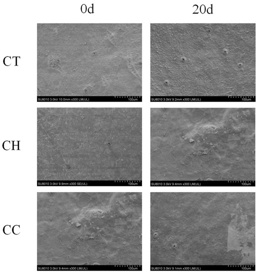 Figure 2 shows that the coated citrus had a brighter color and better appearance quality. In addition, the size and number of stomata in the cuticle of the citrus were also affected by coating. SEM showed that the orange peel was smoother after coating. As Figure 3 shows, both coatings could fill the stomata of the citrus, reducing the amounts of stomata and porosity and inhibiting the respiration and transpiration rates. At the later stages of storage, the surface of the fruits in the CH group was rough, while in the CC group there was less degradation, indicating that the CC composite film increased the barrier performance and protection ability against pathogens. Both Figure 2 and Figure 3 show that the closed stomata had a positive effect on prolonging the shelf life of citrus fruit.