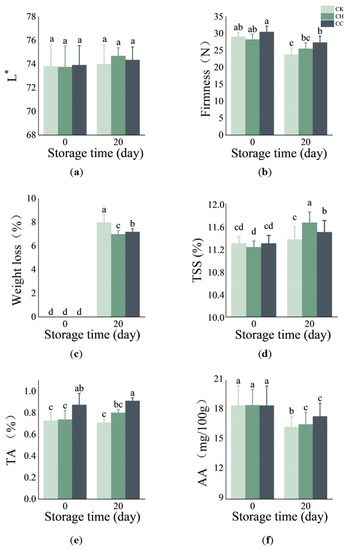 (a) L* value; (b) firmness; (c) weight loss rate; (d) TSS; (e) TA; and (f) AA content of citrus before and after storage. Different letters indicate significant difference in all treatments during storage period (p < 0.05).