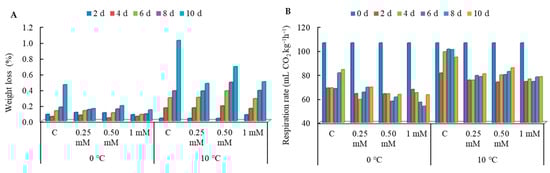 The weight loss (%) of rocket leaves increased steadily at both storage temperatures (Figure 1A). However, in general, it can be argued that these increases were minimal due to the high moisture content in MAP and relatively low water loss. Similarly, Manolopoulou and Mallidis [34] reported that high CO2, low O2, and high humidity in MAP with prolonged storage time effectively reduced water loss from the products and thus weight loss. In the study, on day 2 of storage, weight loss ranged between 0.08% and 0.11% at 0 °C and between 0.03% and 0.08% at 10 °C. At the end of storage on day 10, weight loss values were between 0.14% and 0.46% at 0 °C and between 0.47% and 1.02% at 10 °C. It was determined that the weight loss of rocket leaves stored at 10 °C was higher than those stored at 0 °C (Figure 1A). This can be explained by the fact that respiration is better suppressed at low temperatures, and the metabolic rate is slowed down. Erbaş and Koyuncu [12] reported that the weight loss in the products increased due to the removal of water from the tissues during respiration; thus, the respiration rate was effective in weight loss. This is supported by the fact that OA treatments (especially 1 mM OA) were more effective than the control treatment at both storage temperatures in terms of reducing weight loss and suppressing respiration rate.