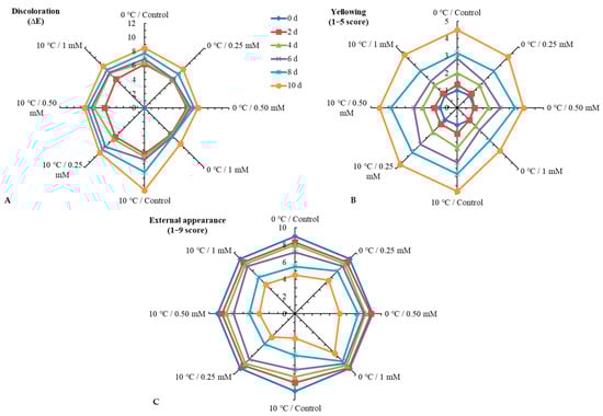 Yellowing is the biggest ripening symptom in green leafy vegetables [26]. The rocket leaves’ color and appearance were affected by treatments and storage temperature (Table 1). In line with the prolonged storage period, yellowing increased in the leaves, resulting in color and external appearance deterioration. The color change in the rocket leaves started on the second day, and the highest color change (∆E: 8.48, 0 °C and 11.74, 10 °C) was detected in the control group at both storage temperatures on day 10 at the end of storage. At the end of storage, the 1 mM OA dose (∆E: 7.23, 0 °C and 8.34, 10 °C) was the most effective treatment in color preservation at both storage temperatures (Figure 2A). In line with the color change, yellowing and external appearance scores also increased during storage. On the 10th day of storage, the rocket leaves stored at 10 °C had the highest score in terms of yellowing, while the lowest scores were obtained from those stored at 0 °C. At the end of storage, the control group (4.50 score: 0 °C, 4.83 score: 10 °C) was determined to have the highest yellowing scores at both storage temperatures. The lowest yellowing scores were found in 1 mM OA treatment (3.50 score: 0 °C, 4.33 score: 10 °C) at both temperatures (Figure 2B). At the end of storage, all OA treatments were more effective than the control treatments in terms of yellowing and external appearance (Figure 2B,C). The external appearance scores of the rocket leaves were not significantly changed in the initial 4 days of storage, but after the 4th day, the differences between the treatments became more apparent. At the end of storage, the lowest external appearance scores (4.50: 0 °C, 2.83 score: 10 °C) were obtained from the control groups. As expected, in parallel with the increase in temperature, the external appearance scores of rocket leaves stored at 0 °C were higher than those stored at 10 °C. During storage, the highest external appearance scores were generally found in the 1 mM OA treatment at both storage temperatures (Figure 2C). It was thought that the effect of OA on color change, yellowing, and external appearance could be explained by a slowdown of chlorophyll synthesis and lipid peroxidation, which is known to have an impact on quality. The positive effects of OA on color and appearance have also been reported in studies conducted with different vegetable and fruit species [15,19,36].