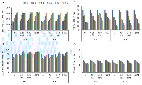 Vitamin C content decreased as the storage period progressed, regardless of the application and temperature. Vitamin C decreases rapidly or slowly after harvesting depending on species, variety, and environmental factors. As shown in Figure 3D, the initial vitamin C content was 1.6 mg g−1 fw and was determined to be between 1.2 (0 °C, 0.5 and 1 mM OA) and 1.0 mg g−1 fw (0 °C: 0.25 mM OA, 10 °C: C and 0.25 mM) at the end of storage on day 10. Vitamin C content decreased at the end of storage, but no significant differences were observed between the treatments. This was associated with the preservation of rocket leaves under MAP conditions. MAP may have delayed the oxidation of vitamin C in all treatments by regulating the permeability of oxygen and carbon dioxide in it, and vitamin C can also be easily affected by many factors such as temperature, light, and the presence of oxygen, so the responses of rocket leaves to the treatments in terms of changes in vitamin C content may be different.