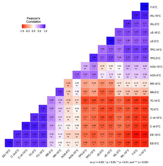 In the study, it was observed that many factors interact with each other to impact quality of rocket leaves during storage, so a correlation analysis study is needed. Figure 4 showed the correlation analysis results of the quality parameters of rocket leaves for the test. As expected, in terms of the analyzed parameters, a highly positive correlation was generally determined between samples stored at 0 °C and 10 °C. The highest significant negative correlation (r: −0.98; p < 0.001) was identified between EE (10 °C) and yellowing values (0 °C and 10 °C), while the highest significant positive correlation (r: 0.99 ; p < 0.001) value was identified between YY (0 °C) and YY (0 °C).