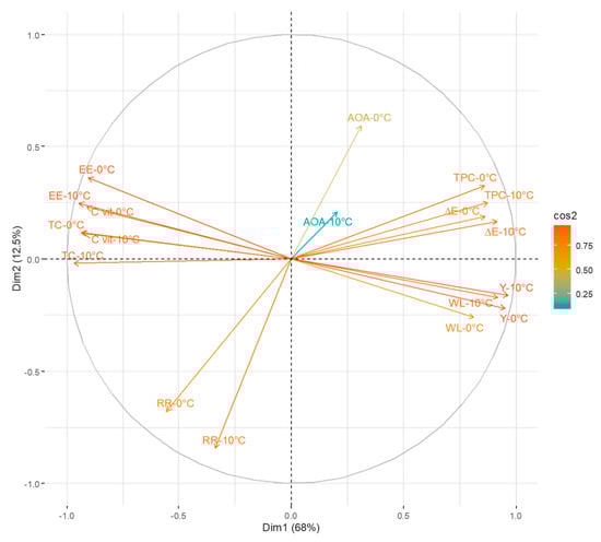 The squares of the coordinates (cos2) provide a measure of how well the major component expresses the relevant variable. Cos2 can be used to represent these values. The correlations between the variables and principal components are another way to express these values. The first principal component explains 68% of the variance, and the second principal component explains 12.5%. The squares of the coordinates (cos2) are an indicator of how successfully the variable of interest is represented by the principal component and is expressed as cos2. These values are also expressed as correlations between variables and principal components. When the vector directions of the properties were examined, it was seen that EE, C vit, TC, and RR exhibited negative correlations with the other properties. Among the properties that were examined, AOA had the lowest cos2 value and was considered to have the lowest effect on the principal components (Figure 5).
