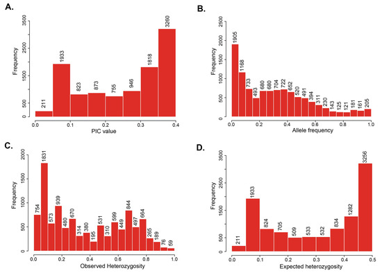 Distribution of genetic diversity of 10,619 SNPs in the 50 longan accessions. (A) Polymorphic information content (PIC). (B) Allele frequency. (C) Observed heterozygosity (Ho). (D) Expected heterozygosity (He).
