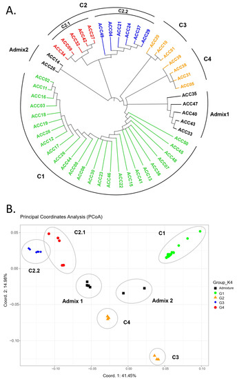 Furthermore, we analyzed the genetic relationships among the 50 longan accessions using UPGMA-based clustering analysis and principal coordinate analysis (PCoA) based on the 10,619 SNPs. The UPGMA tree revealed six main clusters (C1–C4, Admix1, and Admix 2) of the 50 longan accessions (Figure 3A; Table S4). Group C1 (25 accessions) was similar to group G1, as identified by STRUCTURE. Group C2 (11 accessions) contained two subgroups, C2.1 and C2.2, similar to groups G2 and G3, respectively, as determined by STRUCTURE. Groups C3 (4 accessions) and C4 (3 accessions) together resembled group G4 from STRUCTURE. The groups Admix1 and Admix2 belonged to the admixture group of STRUCTURE. The admixture groups of Thai longan accessions (ACC35, ACC47, ACC40, ACC43, and ACC33) and those of foreign longan varieties (ACC14 and ACC25) were clearly separated (Figure 3A). PCoA analysis revealed longan clusters consistent with STRUCTURE and the UPGMA tree (Figure 3B; Table S4). The first two PCs explained 41.45% and 14.98% of the variation, respectively.