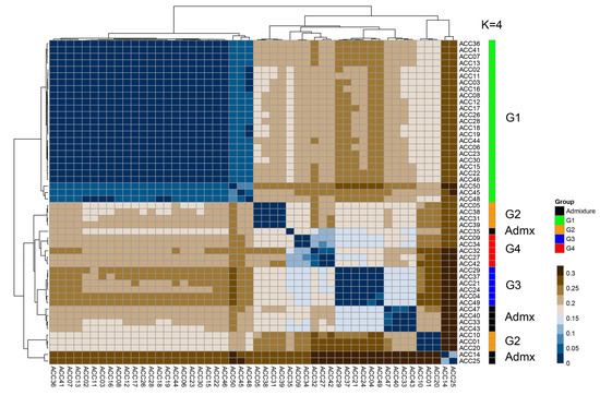 Hierarchical cluster dendrogram and heatmap based on the dissimilarity matrix from 10,619 SNPs representing the genetic relationships among 50 longan accessions. The four STRUCTURE subpopulations and admixtures are shown with G1-4 and Admx and color bars corresponding to each STRUCTURE group. Degrees of relatedness are indicated by colors ranging from dark blue (strong relatedness) to brown (no relatedness).