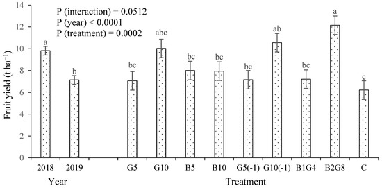 Effect of year and guano and biochar on okra fruit yield (G, guano; B, biochar; C, control; 5, 10, 1, 4, 2, 8, t ha−1; (-1), applied 1 month before sowing). Separately for year and treatments, the same letter in a given bar means that there were no significant differences according to Tukey’s HSD test (α = 0.05). Line segments at the tops of the bars indicate the standard errors (n = 3).