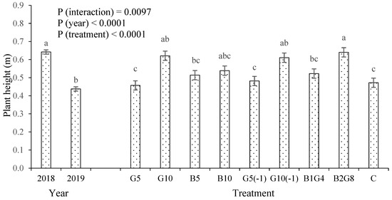 Effect of year and guano and biochar on okra plant height (G, guano; B, biochar; C, control; 5, 10, 1, 4, 2, 8, t ha−1; (-1), applied 1 month before sowing). Separately for year and treatments, the same letter in a given bar means that there were no significant differences according to Tukey’s HSD test (α = 0.05). Line segments at the tops of the bars indicate the standard errors (n = 3).