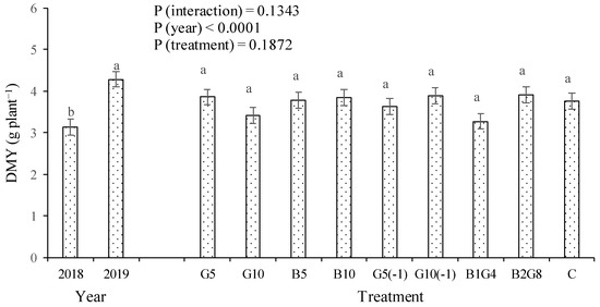 Effect of year and guano and biochar on dry matter yield (DMY) of cabbage in the pot experiment (G, guano; B, biochar; C, control; 5, 10, 1, 4, 2, 8, t ha−1; (-1), applied 1 month before sowing). Separately by year and treatments, the same letter in a given bar means that there were no significant differences according to Tukey’s HSD test (α = 0.05). Line segments at the tops of the bars indicate the standard errors (n = 3).
