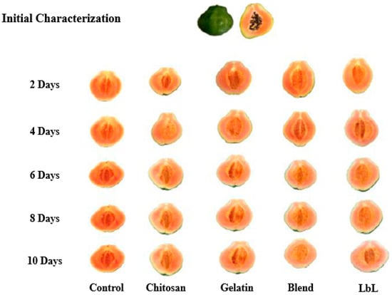 Effects of chitosan and gelatin coatings on freshly processed papayas in control treatments and coated with chitosan, gelatin, blend, and layer-by-layer storage for 10 days at 5 °C.