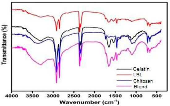 The FTIR spectra of gelatin, chitosan, gelatin + chitosan (blend), and chitosan-gelatin (layer-by-layer) films were evaluated, and the results are presented in Figure 2. Typical bands characteristic of chitosan and gelatin films were observed.
