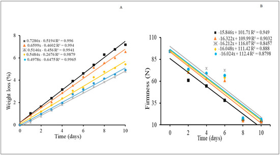 Effects of chitosan and gelatin-based coatings, (A) weight loss and (B) firmness in freshly processed papayas from the control (■) and chitosan (▲), gelatin (ж), blend (♦), and layer-by-layer treatments (●) stored for 10 days at 5 °C.