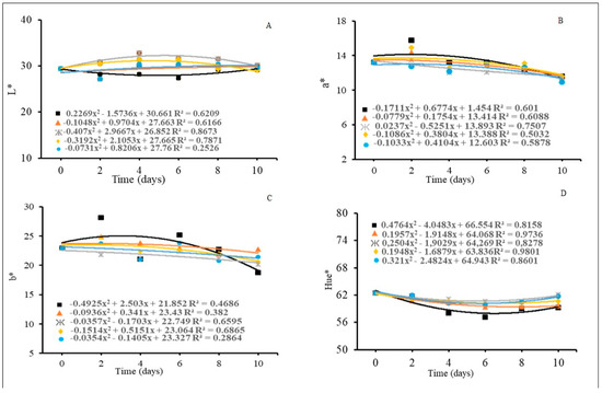 Effects of chitosan and gelatin-based coatings (A) luminosity, (B) a*, (C) b*, and (D) hue, of minimally processed papayas in the control (■), chitosan (▲), gelatin (ж), blend (♦), and layer-by-layer treatments (●) stored for 10 days at 5 °C.