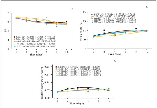 Regarding pH, it was observed that there was a significant difference (p < 0.01) in time and in the interaction between coatings and storage time. The pH of papayas ranged from 5.50 to 6.49 (Figure 5A). The fruits of the gelatin and blend treatments showed the highest pH values until the sixth day of evaluation, with a subsequent reduction until the last day, with averages of 6.18 and 6.14, respectively. The fruits of the layer-by-layer and chitosan treatments showed constant pH values over the days, with averages of 5.98 and 6.02, respectively. The greatest variations in pH values during the storage period were from the control treatment fruits, with increase and decrease over the days; the pH of these fruits averaged 6.11.