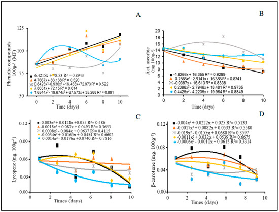 Lycopene and β-carotene: β-carotene and lycopene were determined using the method of [26]. Furthermore, 300 mg of the pulp was used, shaking vigorously with 10 mL of an acetone–hexane mixture (4:6), and then filtered. Concentrations were determined by observing measurements at absorbances of 453, 505, 645, and 663 nm. Results were expressed in mg of lycopene/g, and mg of β-carotene/g. For determination, Equations (2) and (3) were used.