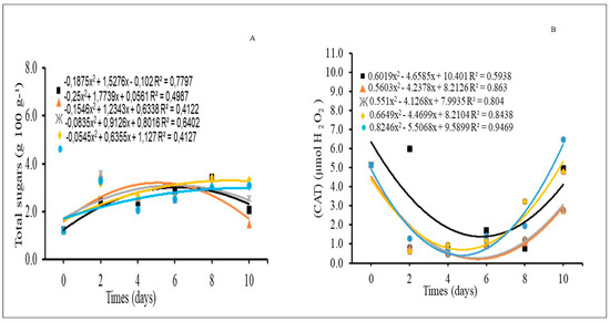 Total sugars were determined by the anthrone method, described by Yemm and Willis [28]. Furthermore, 0.5 g of the samples were weighed, ground in a mortar, and diluted in 50 mL of distilled water. Afterwards, they were left to rest and a filtration was carried out. The reagents were placed in the test tubes, following the same order as the standard curve. Then, the sample, water, and 0.2% anthrone were added. The tubes were placed in a water bath at 100 °C for 3 min, followed by a bath in ice water and subsequent readings. The standard curve was prepared with glucose and readings performed in a spectrophotometer at an absorbance of 620 nm.