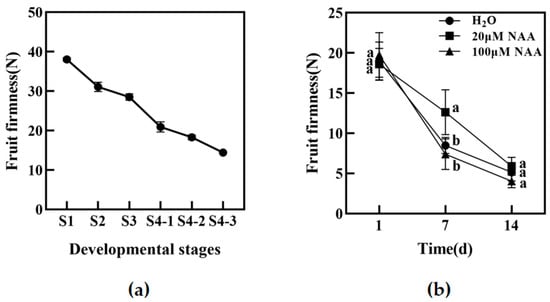 Peach fruits “Okubo” at the developmental stage of S4-1 were selected and treated with deionized water (H2O), 20 μM NAA, and 100 μM NAA, according to the preliminary results of our group. After washing with water and drying naturally, the peach fruit was soaked in the above three solutions, respectively. The solution was placed in a vacuum for 30 min, and the vacuum was slowly released to help the solution enter the peach fruit. After natural drying at room temperature, the treated peach fruits were stored under natural light for 14 days at 20 ± 2 °C. Samples were taken on the 1st, 7th, and 14th days after treatment, and the firmness of the fruits was measured.