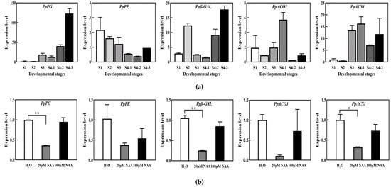 22]. When PpIAAs were identified, the expression levels of 14 genes were higher in the melting “Okubo” than in the stony hard “Jing Yu” during almost all developmental stages. This strongly suggests that these genes may be related to auxin signaling during peach fruit ripening [