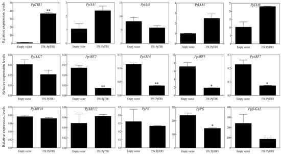 Figure 3). However, it did not reach a significant level, preliminarily indicating that these factors respond quickly to auxin and enhance auxin signaling. The results indicated that the overexpression of the PpTIR1 gene in peach fruit resulted in a decrease in the expression of