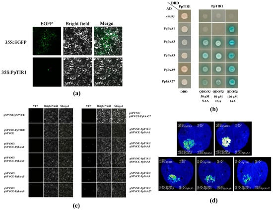 Table S1). PpTIR1 without a stop codon and the full-length coding sequences of the genes were amplified by PCR and constructed into pGADT7 and pGBKT7 vectors by viscous terminal ligation. The PpTIR1-DBD and PpIAA1/3/5/9/27-AD plasmids were co-transformed into Saccharomyces cerevisiae strain AH109, and the yeast cells that contained these two vectors were screened on SD/-Trp-Leu media. When the transformed cells were inoculated on the strict four-deficiency plate SD/-Trp-Leu-His-Ade/X-α-Gal/auxin, different concentrations of NAA, 2,4-D, and IAA were added to check the effect according to previous research [