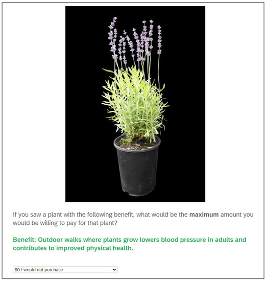 To elicit WTP amounts, participants were provided a predetermined list of prices in USD 5 increments ranging from USD 0 (would not buy) to USD 101+ (more than USD 100). The provided price ranges accurately reflect potential plant prices across the U.S. in 2020 and 2021. Participants viewed a picture of a lavender plant (Lavandula angustifolia Mill.) in a 4-inch pot while determining their WTP amounts. No other information was provided to participants because one of the goals of this study was to establish a base price for plant benefit information. Previous studies have found that the plant aesthetic, production methods [19], and involvement and experience in plant-related activities all strongly impact behavior [24,25]. An example of a survey question and the question format is provided in Figure 1.