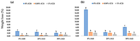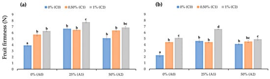 The study showed that chitosan-based and AV-based edible coating significantly improved strawberry fruit firmness during storage, mainly when combined (Figure 1a,b). After two days of storage (DAS), the uncoated fruits (c0a0) firmness value was 3.92 N, while fruits coated with edible coating had higher fruit firmness values of: 6.67 (c0a1), 5.10 (c0a2), 5.69 (c1a0), 6.47 (c1a1), 6.37 (c1a2), 6.28 (c2a0), 7.75 (c2a1), and 6.86 N (c2a2). Interestingly, fruits coated with 1% chitosan and 25% AV (c2a1) had the best fruit firmness value at 2 DAS. Observations at 4 DAS revealed a more interesting finding. Uncoated fruits had a similar firmness value to c0a2 (50% AV), but uncoated fruits had a significantly lower firmness value than c0a1 (25% AV). Interestingly, a similar occurrence was observed with chitosan-based coatings at 4 DAS. The addition of 50% AV decreased fruit firmness, while 25% AV gel increased fruit firmness (Figure 1b).