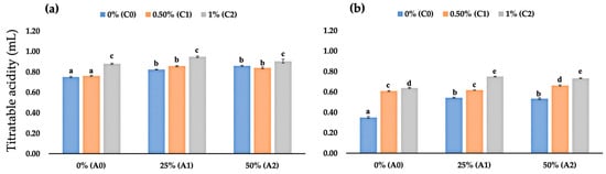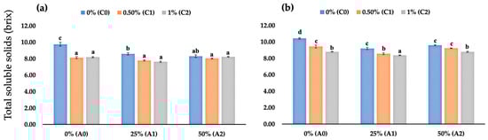 The TA is mainly used to estimate the organic acid content [41,42]. In this study, uncoated fruits had the lowest TA content. It was assumed that the chitosan coating modified the internal atmosphere of the fruit by reducing the O2 uptake and keeping CO2 at a high level [43], affecting respiration activities among all stored fruits. Hence, its titratable acidity was the lowest. In contrast, fruits with an edible coating, especially an edible coating made by combining 1% chitosan and 25% AV, had the highest titratable acidity values (Figure 4a,b). The thin layer of edible coating on the surface of the fruit reduced the fruit’s capability to fix O2, thereby reducing respiration [36]. The reduction in fruit titratable acidity during storage was mainly caused by using organic acids for respiration [44]. Therefore, fruits with higher respiration had lower titratable acidity than those with lower respiration activities.