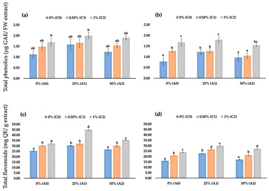 (a) Fruit total phenolics content of coated and uncoated fruits at 2 DAS; (b) fruit total phenolics content of coated and uncoated fruits at 4 DAS; (c) fruit total flavonoid content of coated and uncoated fruits at 2 DAS; (d) fruit total flavonoid content of coated and uncoated fruits at 4 DAS. Data represent mean ± standard error (SE) of three replicates with ten fruits per replicate. Bars with same letter are not significantly different according to the Tukey-HSD test at 5%. p value for the test was 0.05 < p-value < 0.025.