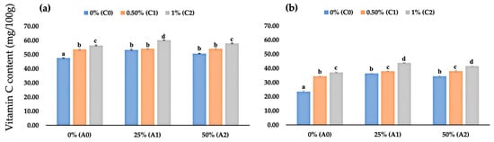 Our observation revealed that applying chitosan, AV, or a mixture of both as edible coating significantly affected fruit vitamin C content at 2 DAS and 4 DAS (Figure 6a,b). At 2 DAS, uncoated fruits had the lowest vitamin C content among all stored fruits, with an average value of 47.54 mg/100 g. In contrast, fruits coated with a mixture of 1% chitosan and 25% AV had the highest vitamin C content among all stored fruits, with an average value of 60.22 mg/100 g (Figure 6a). Interestingly, at 4 DAS, mixture-based edible coating performed better than chitosan or AV edible coating (Figure 6b). Fruits coated with chitosan and AV had a higher vitamin C content than uncoated fruits and fruit coated with only chitosan or AV.
