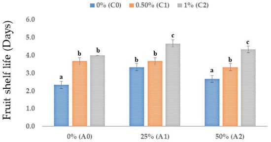 In this study, the application of the edible coating, made specifically by combining chitosan with AV, significantly affected strawberry fruit shelf life during storage at room temperature (Figure 7). At 2 DAS, uncoated fruits had the shortest shelf life among all stored fruits, with an average value of 2.3 days, while fruits coated with a mixture of 1% chitosan and 25% or 50% AV had the most extended shelf life among all stored fruits, with an average shelf life of 4.7 and 4.3 days, respectively (Figure 7).