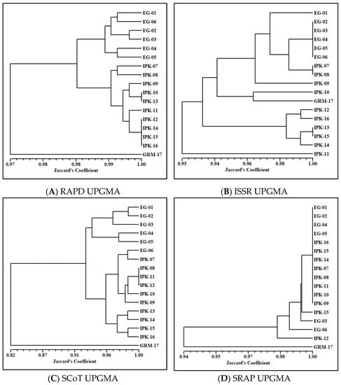 To figure out the genetic relationship among the tested genotypes, molecular data of the four different markers were used to perform a cluster analysis. Four dendrograms were obtained based on Jaccard’s coefficient of similarity (Figure 1). The RAPD-based dendrogram separated the genotypes into three main clusters (Figure 1A). The first cluster included all genotypes collected from Egypt and grouped them into three subclusters (EG-01 and EG-06, EG-02 and EG-03, EG-04 and EG-05). The second cluster gathered all the IPK genotypes, while the third cluster contained the genotype GRM-17 alone at a similarity value of 0.97. Some genotypes showed 100% similarity: these were IPK-10 and IPK-13 and IPK-12, IPK-14, IPK-15 and IPK-16. The ISSR-based dendrogram was different from that based on RAPD, in which the genotypes were separated into four main clusters (Figure 1B). All genotypes collected from Egypt were placed in the first main cluster, along with IPK-07, IPK-08 and PK-09. The second main cluster, interestingly, gathered IPK-10 with GRM-17, while the third main cluster consisted of the rest of the genotypes (IPK-12, IPK-16, IPK-13, IPK-15 and IPK-14). In addition, the genotype IPK-11 was separated alone in the fourth main cluster at a similarity value of 0.93. The dendrogram of SCoT data was more similar to that of RAPD than that of ISSR. However, a wider range of similarities was exposed on the SCoT-based dendrogram scale than on both others. All the genotypes collected from Egypt were grouped in the first main cluster except EG-06. The other genotypes of IPK with EG-06 formed the second main cluster, in which three subclusters were generated (Figure 1C). Meanwhile, the genotype GRM-17 was placed in the third main cluster alone at a similarity value of 0.82. The fourth dendrogram was made based on SRAP data, which was highly different from the previous ones. Out of the seventeen genotypes, twelve showed 100% similarity and were placed in one cluster at 1.00 similarity. The other five genotypes (i.e., IPK-13, EG-03, EG-06, IPK-12 and GRM-17) were placed in sub-branches separately, with the lowest similarity of 0.94 for GRM-17 (Figure 1D). This difference among the dendrograms might be due to the different regions of the genome that each molecular marker covered and the number of primers used.