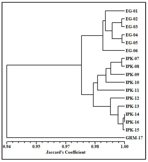 For a better conclusion and to comprehend the relationship among the tested genotypes, a dendrogram was made based on data from all the molecular markers (Figure 2). The dendrogram separated the genotypes into three main clusters in a way somewhat similar to that based on RAPD data. The first main cluster consisted of all genotypes collected from Egypt. The second main cluster included all genotypes of IPK, while GRM-17 was separated alone in the third main cluster at a similarity value of 0.94. Based on the data of all the molecular markers, the IPK-14 and IPK-16 genotypes showed 100% similarity.