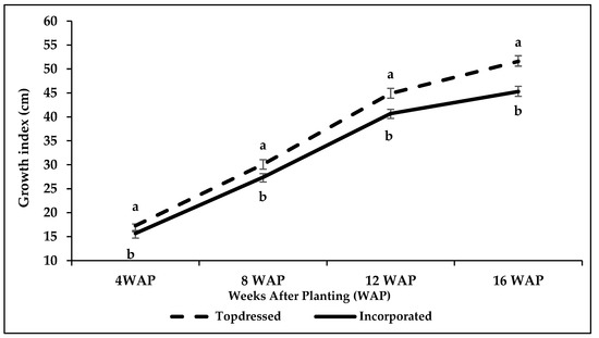The difference in growth index for hibiscus grown in a substrate with fertilizer placement either topdressed or incorporated in the bottom strata. Measures were reported from 4 to 16 weeks after planting (WAP). Error bars represent standard errors from the mean. The same letters on each WAP are not significantly different according to the student-t test at p < 0.05.