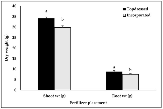 However, fertilizer placement significantly affected the growth index as well as both shoot and root dry weights, with topdressed plants being slightly larger than plants fertilized by incorporation (Figure 1 and Figure 2).
