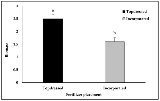 This result was similar to previous reports where topdressing resulted in significantly higher growth of spotted spurge and large crabgrass compared to sub-dressing, a fertilizer placement method similar to stratification [29]. In another container study, subdressing fertilizer at a depth of 2.5 cm did not reduce the germination of eclipta compared to a topdressed container, but a decrease in shoot dry weight of eclipta was observed compared with topdressing [20]. This response can be species-specific, and a depth of 5 cm or more has shown to be more effective in consistently controlling several common container nurseries weed species [20,22] compared with the 2.5 cm depth that was evaluated in this study.