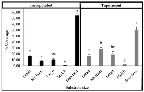 The difference in surface area coverage of liverwort grown in substrate with fertilizer placement either topdressed or incorporated in the bottom strata. Error bars represent standard errors from the mean. The same letters on each substrate size are not significantly different according to student-t test at p < 0.05.