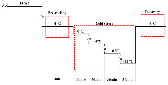 Plants at 25 °C were placed at 4° C for 48 h to precool. It was confirmed in a preliminary experiment that the precooling treatment increases the survival rate after the treatment at a temperature below the freezing point. Fully fledged low-temperature treatment was performed at 0 °C for 30 min, −4 °C for 30 min, −8 °C for 30 min, and −12 °C for 30 min each. After low-temperature treatment, the plants were placed again at 4 °C to recover (Figure 1).