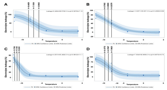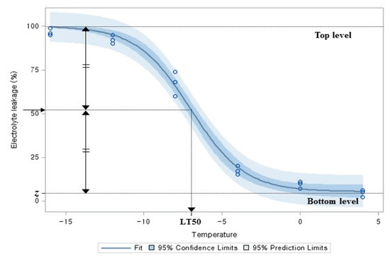 The LT50 means the median lethal temperature (Figure 2). The LT50 represents the temperature at which the electrolyte leakage level reaches the mid-point between the lowest and highest levels. In this study, the temperature at which the electrolyte leakage was over 50% was used, and this was a relatively easy method to compare plants [29,30]. The plant’s response to cold stress appears as a sigmoid curve in the lethal temperature function [31]. Using the following basic formula (Equation (2)), the lethal temperature of the plant was estimated. According to many previous studies, the relationship between cold stress and electrolyte leakage also shows a sigmoid curve [10,32,33]. In this study, a non-linear regression method was used to obtain the LT50.