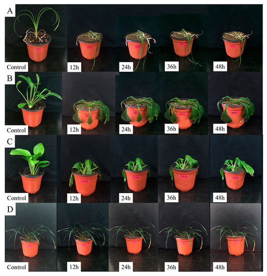 The visual observations of different species, according to cold treatments. ((A): H. fulva, (B): H. longipes, (C): H. plantaginea, and (D): S. scilloide.)