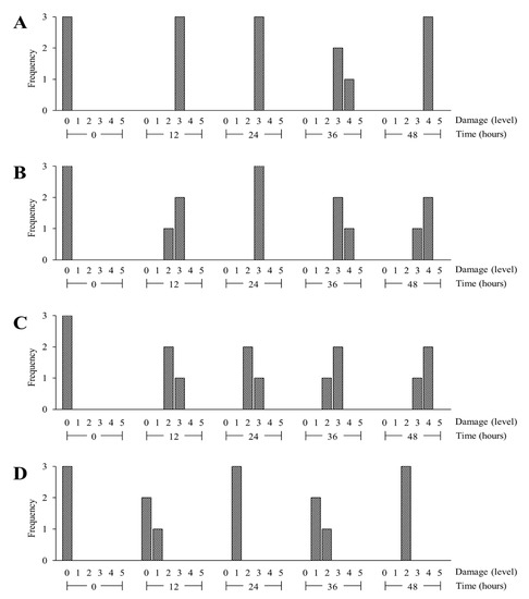 The visual damage changes of different species, according to cold treatments. After cooling the plants at 4 °C for 48 h, the plants were cooled again at −6 °C intervals from 12 h up to 48 h. Visual damage of freezing was recorded as 0 = no damage, 1 = ≤10% damage, 2 = 11 to 50% damage, 3 = 51 to 90% damage, 4 = ≥90% damage, 5 = death. ((A): H. fulva, (B): H. longipes, (C): H. plantaginea, and (D): S. scilloide.)