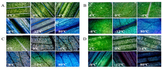 Changes in Evan’s blue staining appearance under low temperatures. ((A): H. fulva, (B): H. longipes, (C): H. plantaginea, and (D): S. scilloide.)