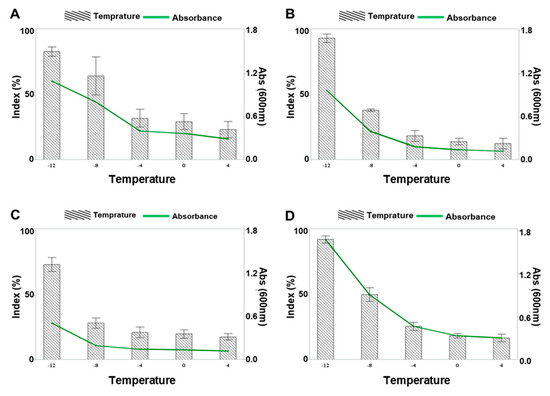 AbsC: absorbance value of the cold-stressed sample; AbsNC: absorbance value of negative control; AbsPC: absorbance value of positive control.