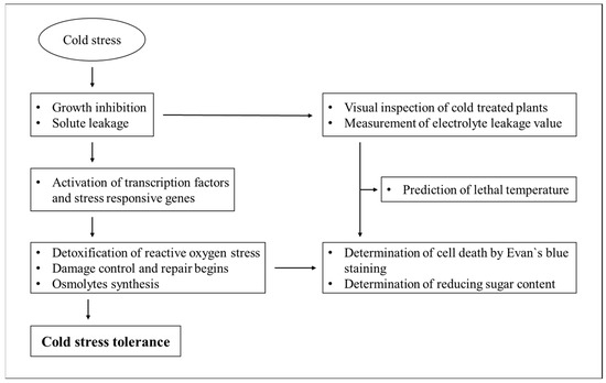 Stress is any substance or stimulus that restricts plant metabolism, growth, development, or crop productivity, and includes biotic and abiotic stresses [3,4]. Cold stress, including chilling (0–15 °C) and freezing (<0 °C), is an abiotic stress that adversely affects the growth and agricultural productivity of plants [5,6].