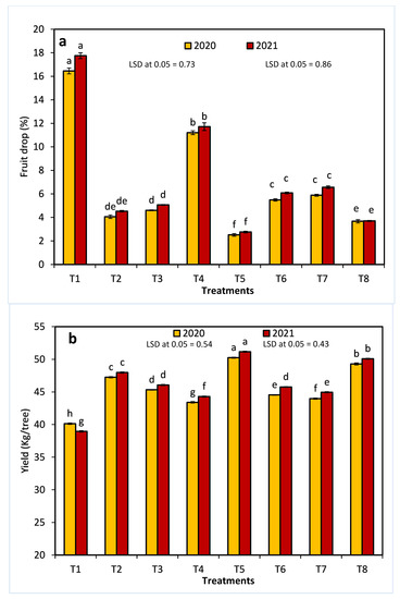 The productivity of Anna apples was evaluated by measuring the following parameters: fruit drop, fruit yield, and fruit yield increment. To determine the drop percentage, from 28 days before the anticipated harvest time, the number of fallen fruits under a tree was counted twice a week until the harvest date. The fruits remaining on the trees were then harvested, and the percentage of fruit drop was calculated according to Yildiz et al. [58] using the following equations: