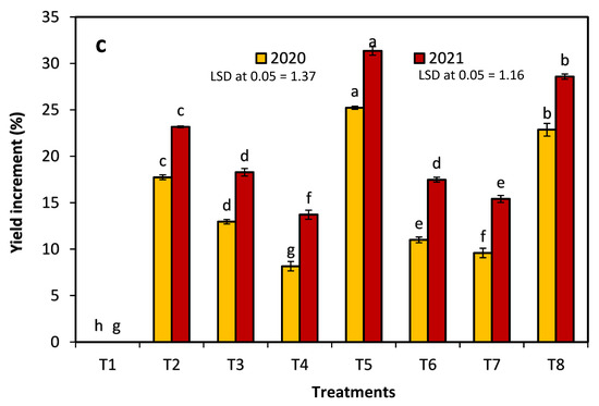 The effects of 1-methylcyclopropene (1-MCP), aminoethoxyvinylglycine (AVG), naphthalene acetic acid (NAA), and combinations thereof on fruit drop (a), yield (b), and yield increment (c) of Anna apples in the 2020 and 2021 seasons. (T1): control; (T2): 320-ppm 1-MCP; (T3): 250-ppm AVG; (T4): 20-ppm NAA; (T5): 320-ppm 1-MCP + 250-ppm AVG; (T6): 320-ppm 1-MCP + 20-ppm NAA; (T7): 250-ppm AVG + 20-ppm NAA; and (T8): 320-ppm 1-MCP + 250-ppm AVG + 20-ppm NAA. Different letters indicate significant differences at p ≤ 0.05.