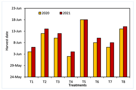 The treatments’ effects on the extension of the Anna apple harvest date in the 2020 and 2021 seasons are presented in Figure 2. The results revealed that, in both seasons, the fruits treated with 20 ppm NAA (T4) were the first reach to their harvest date, followed by the control fruit, and then the fruit treated with 250 ppm AVG + 20 ppm NAA (T7). Conversely, the latest harvest dates in both seasons were observed in the trees sprayed with 320 ppm 1-MCP + 250 ppm AVG, followed by T8. For the control, in both seasons, T5 effectively delayed the harvest date by 14 days, whereas the application of T4 brought the harvest date forward by two days.