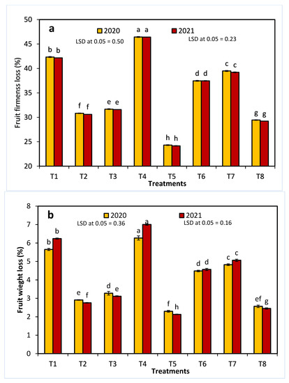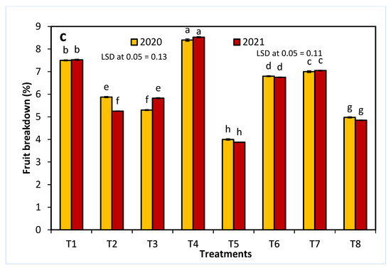 As shown in Figure 3, all treatments, except for 20 ppm NAA, significantly decreased the loss of fruit weight and firmness at one week postharvest. In comparison with all other sprayed growth regulators, treatment T5 resulted in the lowest percentages of fruit firmness loss and fruit weight loss in both seasons. Similarly, fruit breakdown was decreased in all treatments, except for 20 ppm NAA in both seasons, and T5 showed the lowest fruit breakdown percentage.