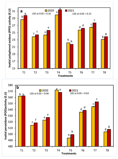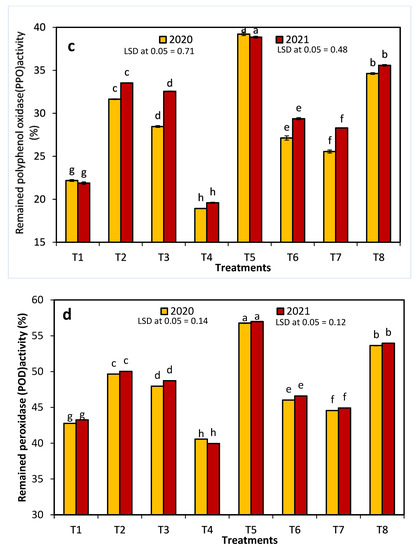 The effects of 1-methylcyclopropene (1-MCP), aminoethoxyvinylglycine (AVG), naphthalene acetic acid (NAA), and combinations thereof on Anna apple polyphenol oxidase (PPO: (a,b)) and peroxidase (POD: (c,d)) activity in the 2020 and 2021 seasons. (T1): control; (T2): 320-ppm 1-MCP; (T3): 250-ppm AVG; (T4): 20-ppm NAA; (T5): 320-ppm 1-MCP + 250-ppm AVG; (T6): 320-ppm 1-MCP + 20-ppm NAA; (T7): 250-ppm AVG + 20-ppm NAA; and (T8): 320-ppm 1-MCP + 250-ppm AVG + 20-ppm NAA. Different letters indicate significant differences at p ≤ 0.05.