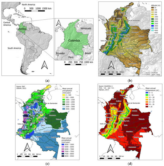 (a) Geographic location of Colombia; Spatial distribution of climate factors and elements: (b) altitude; (c) mean annual precipitation of 1976–2005 (mm/year); (d) mean annual air temperature of 1970–2000 (°C).