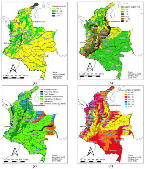 The soil organic carbon distribution map (Figure 2b) highlights varying levels of organic matter content in Colombian soils [38]. Higher percentages of soil organic carbon are typically found in areas with dense vegetation cover, such as the Amazon rainforest and the Andean regions. In contrast, lower organic carbon content is observed in drier regions such as the northern coast and eastern plains. The soil drainage map (Figure 2c) indicates diverse soil drainage classes across Colombia [38]. Well-drained soils are predominant in the highlands and areas with steep slopes, while poorly drained soils are more common in lowland regions, wetlands, and floodplains.